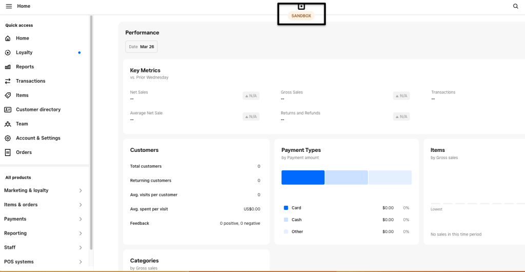 - Click Open on one of the accounts to launch the Sandbox Square Dashboard.
