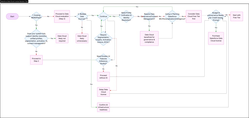 I have started to poke around with Data Cloud and try and figure out where it fit in the ecosystem of Salesforce Products. Below is a bit of a decision tree chatgpt gave me through some refinements with the prompt. And I believe it is quite relevant.